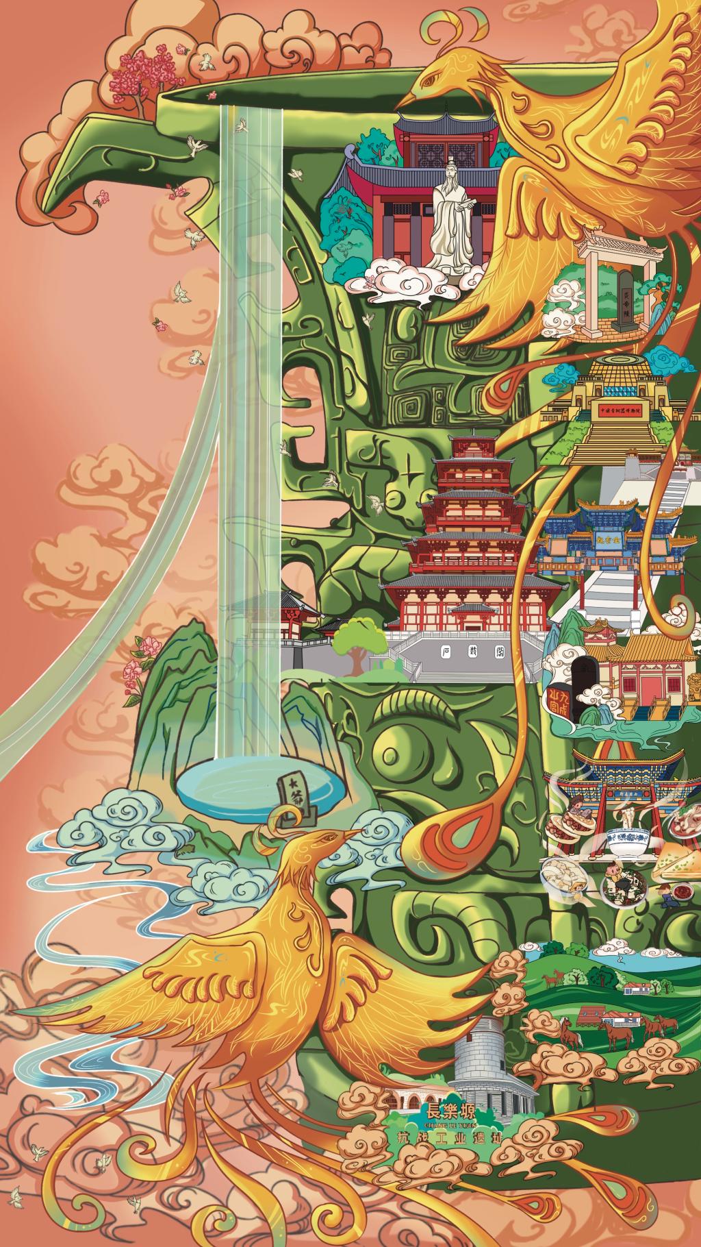 此次设计主题为“看中国 来宝鸡 畅游美丽宝鸡 共享幸福生活”,我校美术学院张海霞老师指导2022级研究生郑玉微,2021级研究生周静、金阳,以国风绘画方式创作宝鸡旅游美景,绘画中涉及宝鸡青铜器博物馆、石鼓阁、西府老街、炎帝陵、周公庙、太白山、关山草原、 长乐塬、金台观等多项承载文化意义的地域标志性建筑,其创作理念是将宝鸡文化特色景点进行融合,同时又具备历史积淀和当代价值主题,更是一种文化载体,呈现的不只是宝鸡的旅游美景,也是新时代“宝鸡”的标签,彰显了城市特色。