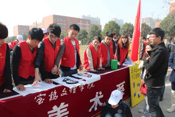 美术系根据专业特点在宣传上勇于创新,在进行学雷锋知识竞答的同时把用版画制作的雷锋头像以奖品的形式发给同学;以“低碳环保、环境保护”为主题进行了素描、绘画设计;展板设计上也颇有用心,呼吁大家“学习雷锋,与你同在”,将自己的手印留在展板上以表示学雷锋的决心。