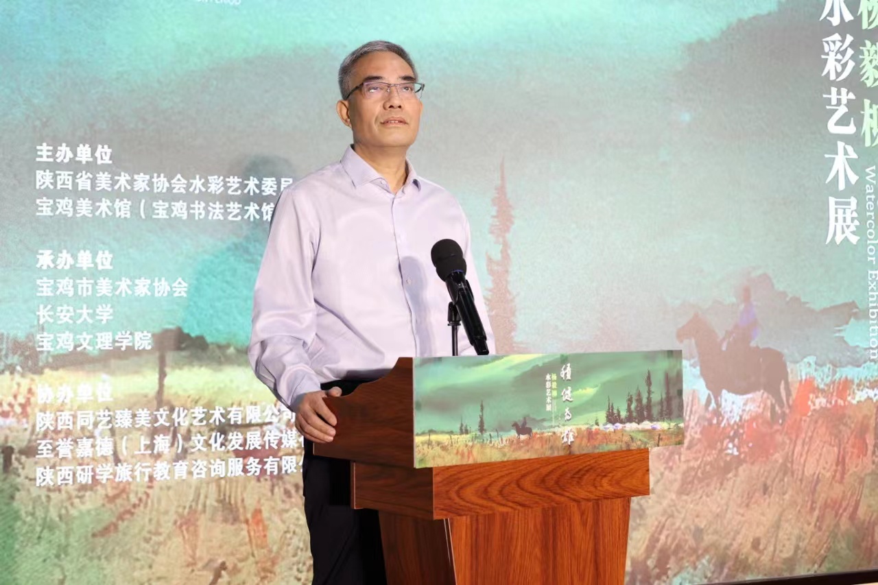 赵健代表学校对画展顺利开幕表示衷心祝贺,对长期以来关心支持学校发展的各位领导、专家致以衷心的感谢。他向与会来宾介绍了学校及美术学院的相关情况,希望美术学院师生坚守初心,自强进取,加强对外联络交流,努力把美术学院办成宝鸡美术人才培养的高地、理论研究的高地、美术创作的高地。