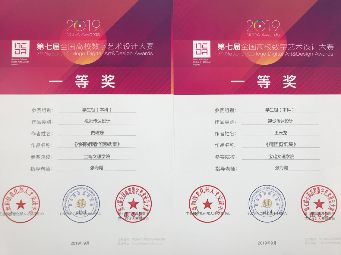 10月19日,在四川师范大学举办的第七届全国高校数字艺术设计颁奖盛典中,我院荣获“优秀组织奖”,并获一等奖2项,二等奖6项、三等奖7项的好成绩。其中由张海霞老师指导的2016级视觉传达专业2班学生贾珺姗、王云龙获得了本科组一等奖。