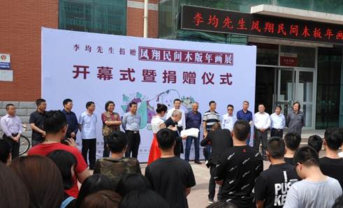 5月23日下午,李均先生捐赠凤翔木版年画展开幕式及捐赠仪式在我校高新校区艺术楼前广场举行,85岁高龄的李均先生将他收藏了30多年的凤翔木版年画170幅全部捐赠给我校“陕西非物质文化遗产传承教育研究中心”,用于支持中心开展的教学与研究工作。校长郭霄鹏、校党委副书记栾宏、副校长杨子元,李均先生以及宝鸡市老科协、市民俗博物馆、美协领导,学校相关职能部门领导与美术学院师生二百余人参加了开幕式及捐赠仪式。