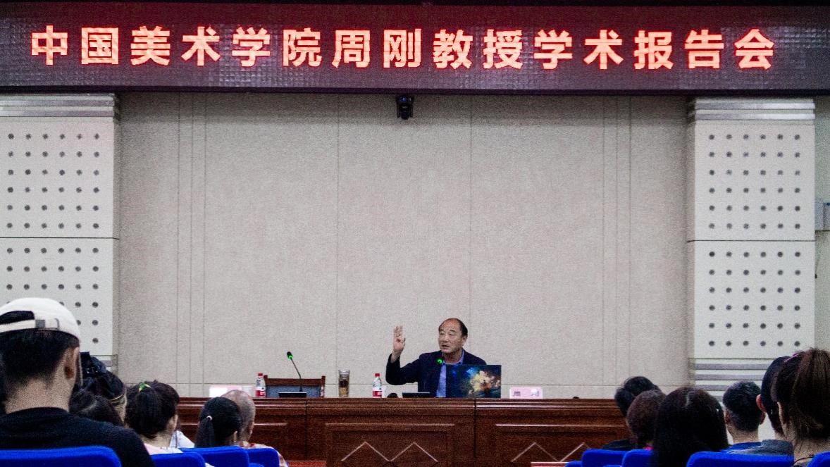聘任仪式后,周刚教授为我校200余名师生作了题为《你若盛开 蝴蝶自来》学术报告。他从人生的方向、目标入题,勉励同学“成功的道路上并不拥挤,因为坚持的人很少。”他展示了从原始到现代的绘画作品,阐释绘画的发展是从写实到写心的过程,他建议同学从五性,即人性、诗性、禅性、佛性等方面锻炼心性,要坐得住也要有把石头破开的精神,始终好于研究。报告内容详实、激情洋溢、情真意切,现场师生掌声热烈。