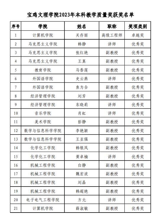 根据《关于评选2023年本科教学质量奖的通知》精神,经个人申报、学院推荐、校教学工作指导委员会评审,我院彭静副教授等其他21名教师被授予“2023年本科教学质量奖”。