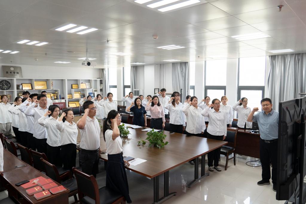 6月26日上午,学院党委在博文楼1301会议室举行2023-2024学年新接收预备党员入党宣誓仪式。党委书记崔小丽、党委副书记常建博、设计学学生党支部书记单福顺、美术学学生党支部书记陈蕾和本学年新接收的36位预备党员参加了仪式。仪式由组织员安芮影主持。