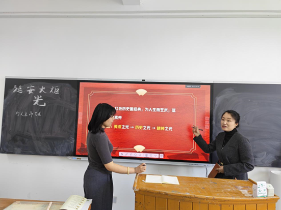 王阿为老师是省级教学能手,宝鸡市优秀教师。王老师结合自身丰富的教学经验,从课堂导入、重难点突破、师生互动、板书设计等方面,对每位研究生的模拟讲课逐一进行点评与指导。她强调,美术课堂应注重审美体验与核心素养的融合,教学设计要贴近学生实际、激发创造力。