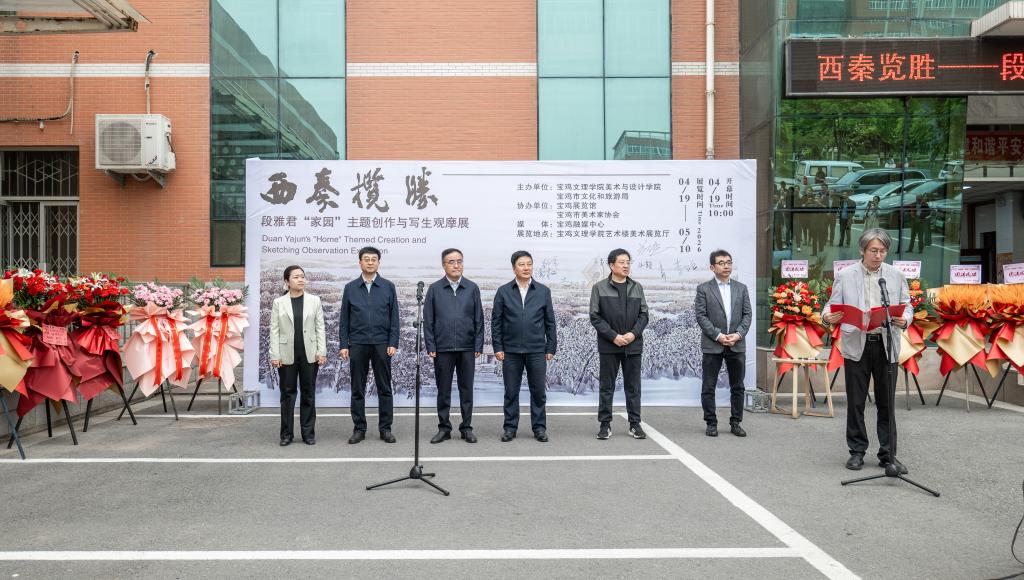 开幕式上,院长李强介绍了展览筹备情况。宝鸡市文化和旅游局局长武云在讲话中对本次校地联合办展给予高度评价。他指出,段雅君创作的《西秦览胜》长卷以宝鸡地区的自然风光、人文名胜为描绘对象,用中国画的笔墨塑造了山水美城的视觉图像,以艺术之力传播宝鸡文化。本次展览不仅为大学生搭建了了解宝鸡自然美景、感悟地域文化的平台,更拓宽了校地文旅合作的广度与深度,希望今后能与太阳集团2138在文旅开发等领域进一步深化合作、携手共进。宝鸡市美术家协会主席李升运肯定了段雅君多年来坚持写生,不断探索在山水画创作领域取得的成绩。段雅君向参加开幕式的嘉宾表达了感谢。