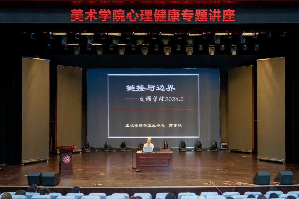 5月15日下午,美术学院邀请宝鸡市精神卫生中心医学心理科主任苏掌权在博文楼报告厅作了题为《链接与边界》的专题讲座,讲座由党委书记田富平主持,学生辅导员、心理健康联络员及学生干部、党员代表共200余人聆听了讲座。