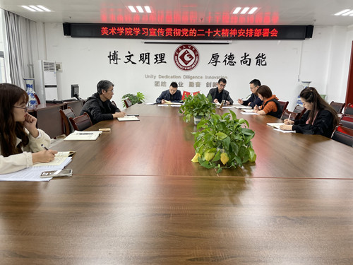 田富平就下一步我院学习宣传贯彻好党的二十大精神做了详细安排。他强调,学习宣传贯彻党的二十大精神是当前和今后一个时期的首要政治任务,一是要引导广大师生原原本本学习研读党的二十大报告和党章,认真领悟党的二十大提出的新思想新论断、作出的新部署新要求。二是要精心谋划,周密部署,开展内容丰富、形式多样的宣传教育活动,切实增强感召力、凝聚力、和影响力。三是要同广大师生思想实际相结合,要能领会、可落实,推动党的二十大精神走进基层、走进群众、深入人心。四是要同广大师生的本职工作和岗位相结合,特别是同美术专业结合起来,同立德树人、科研、创作和当前疫情防控结合起来,产生具有强大的凝聚力和引领力。五是全体师生要以务实的姿态去落实会议精神,党员领导干部、全体教师要将自己所学、所感、所悟及时传达给学生,用党的初心使命感召青年,做好青年大学生的引路人。