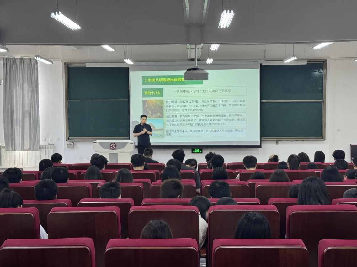 为进一步学习贯彻中央八项规定精神,切实增强师生党员纪律规矩意识,5月29日,校纪委委员、马克思主义学院党总支书记张选朝应邀在博文楼副楼205室为师生党员宣讲中央八项规定精神。地理与环境学院、化学与化工学院师生党员代表共同参与。