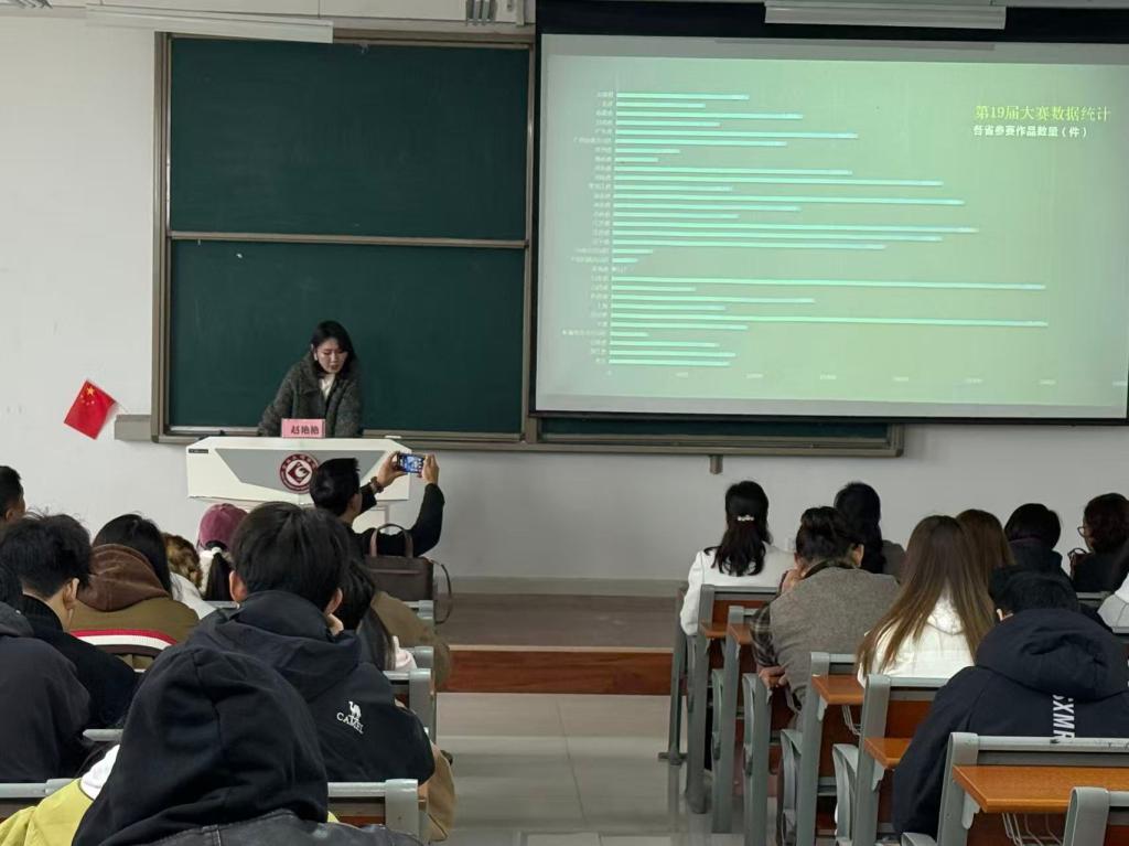 为帮助师生精准把握参赛方向,赵艳艳副教授结合 19 届大赛全国高校参赛数据与获奖案例,直观呈现赛事竞争格局与创作风向标;随后针对 20 届大赛设置的普通赛道(含 24 个细分类别)与专项赛道,逐一拆解各赛道的创作要求、评审侧重点及作品形式规范,为不同专业背景的学生提供清晰的赛道选择指引。她特别提醒参赛学生:需深度理解大赛 “创新为核、情感为魂” 的价值导向,在作品创作中既要坚守原创底线、突出设计新意,也要严格遵循赛事技术规范与提交要求,避免因细节疏漏影响作品竞争力。她鼓励师生通过参赛积累实践经验、提升专业技能,同时借助赛事平台拓展行业视野,为未来职业发展筑牢基础。